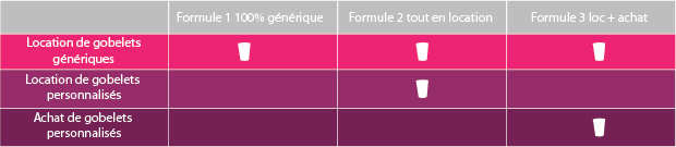 - La combinaison "Location + Achat" (formule 2) : cette formule permet d’utiliser vos propres gobelets Ecocup ® personnalisés et d’avoir, en complément, des gobelets loués pour compléter la demande de vos utilisateurs.